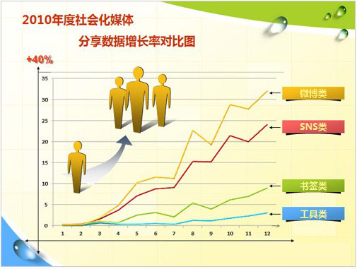 將2010年各類型媒體每月分享數據匯總,我們發現微博類發展迅猛,增速排名第一。