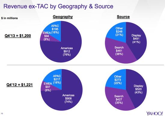 雅虎亞太地區的營收從2012財年的11億下跌至2013財年的8.14億美元,下滑23%。從雅虎投資分析圖表可見亞太業務占據雅虎全球營收的份額一年內從18%降至16%。