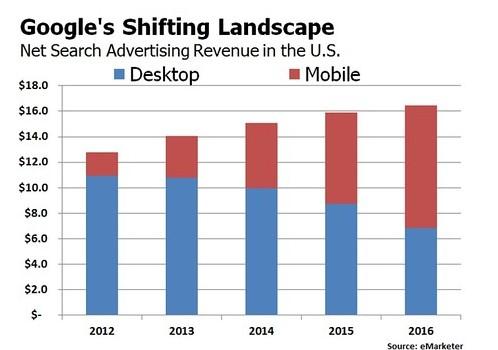eMarketer表示,智能手機和平板電腦市場增長驚人,其正在重塑谷歌業務。eMarketer預計,相較于2013年的383億美元,2014年谷歌在全球市場所獲凈廣告收入將增長14%,至435億美元。