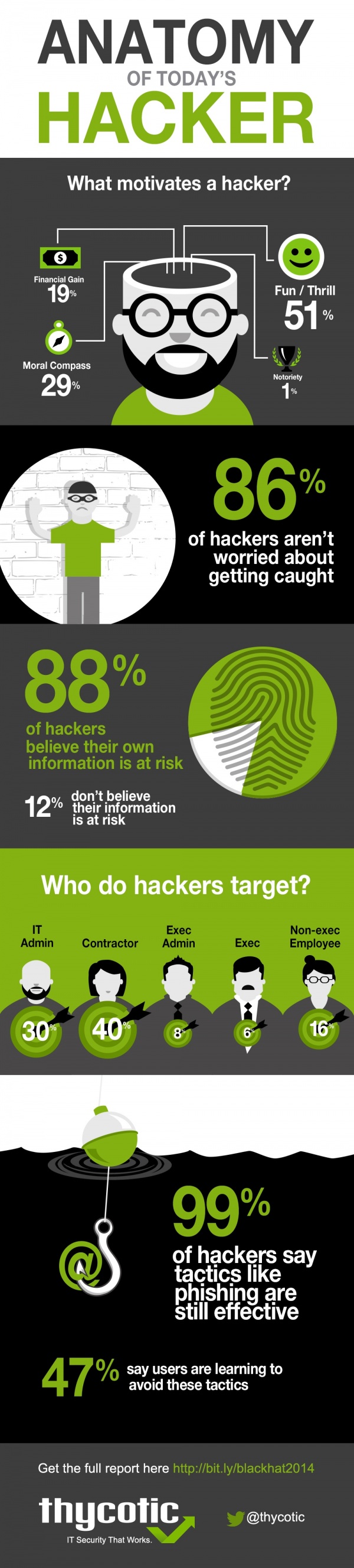 黑帽子黑客如何看待他們所做的惡意活動?根據安全軟件公司Thycotic在2014年對127位不同的黑帽黑客所做的調查顯示,有86%的黑帽黑客認為他們的行為不會造成嚴重的后果。他們中的大多數都認為自己可以凌駕于法律之上。