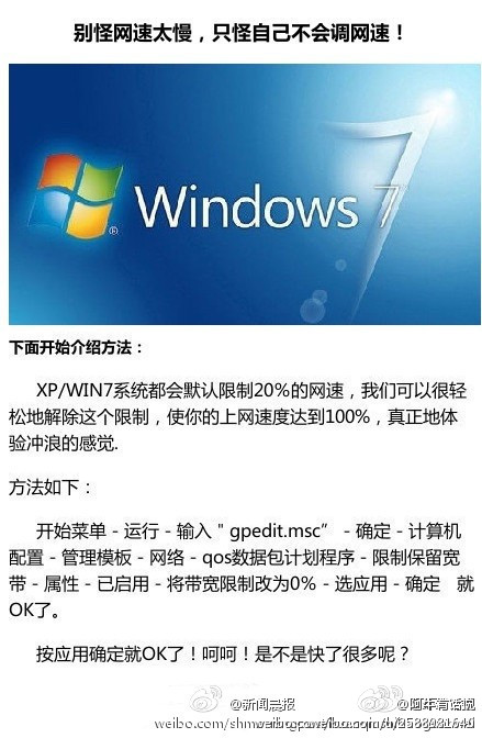 【別怪網速太慢,只怪自己不會調網速!】XP/WIN7系統都會默認限制20%的網速,我們可以很輕松地解除這個限制,使你的上網速度達到100%,真正地體驗沖浪的感覺~!
