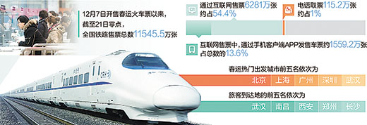 此外,12月12日上線的手機客戶端2.0版改善了用戶購票體驗,簡化了購票操作,同時優(yōu)化了網(wǎng)站購票流程。據(jù)介紹,春運火車票開售以來,手機客戶端發(fā)售車票占比13.6%,12306網(wǎng)站占比40.9%。