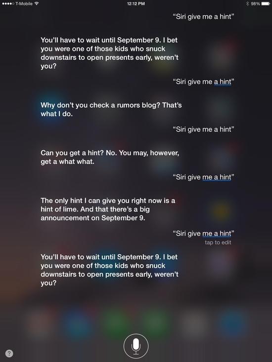 更準確地說,Siri在回應這個問題時真是又萌又調皮,她會讓這些“焦急的人”耐心等到9月9日去了解一切。
