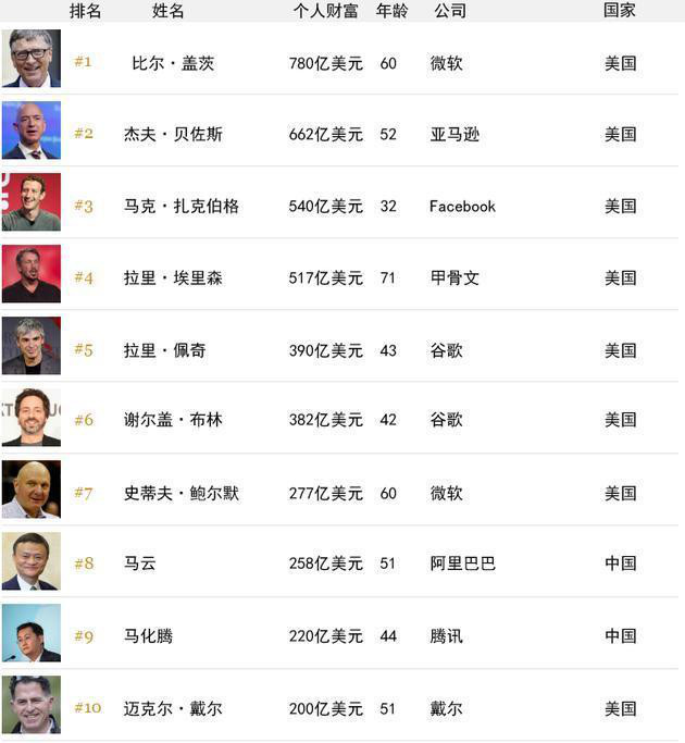 《福布斯》周三發布的第二份科技行業百富榜顯示,微軟聯合創始人比爾·蓋茨以780億美元的個人財富再度登頂,其次是亞馬遜CEO杰夫·貝佐斯(Jeff Bezos)的660億美元和Facebook CEO馬克·扎克伯格(Mark Zuckerberg)的540億美元。甲骨文聯合創始人拉里·埃里森(Larry Ellison)下滑兩位至第4位,個人財富為517億美元。